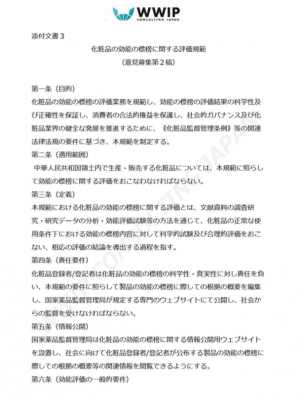 日本語翻訳データ販売開始 2020年11月 新中国化粧品監督管理条例に基づき 中国 Nmpa局発表 化粧品の効能の標榜に関する評価規範 について修正された意見募集第2稿の日本語翻訳を完了 販売を開始 株式会社ワールドワイド アイピー コンサルティングジャパン