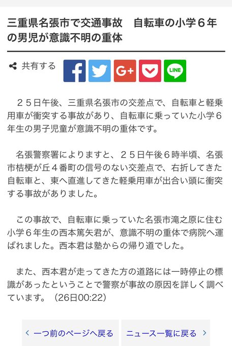 事故 4番町バス停付近の交差点 小学6年生の男の子が車にはねられ重体 三重県名張市桔梗が丘6番町 地域の事件簿
