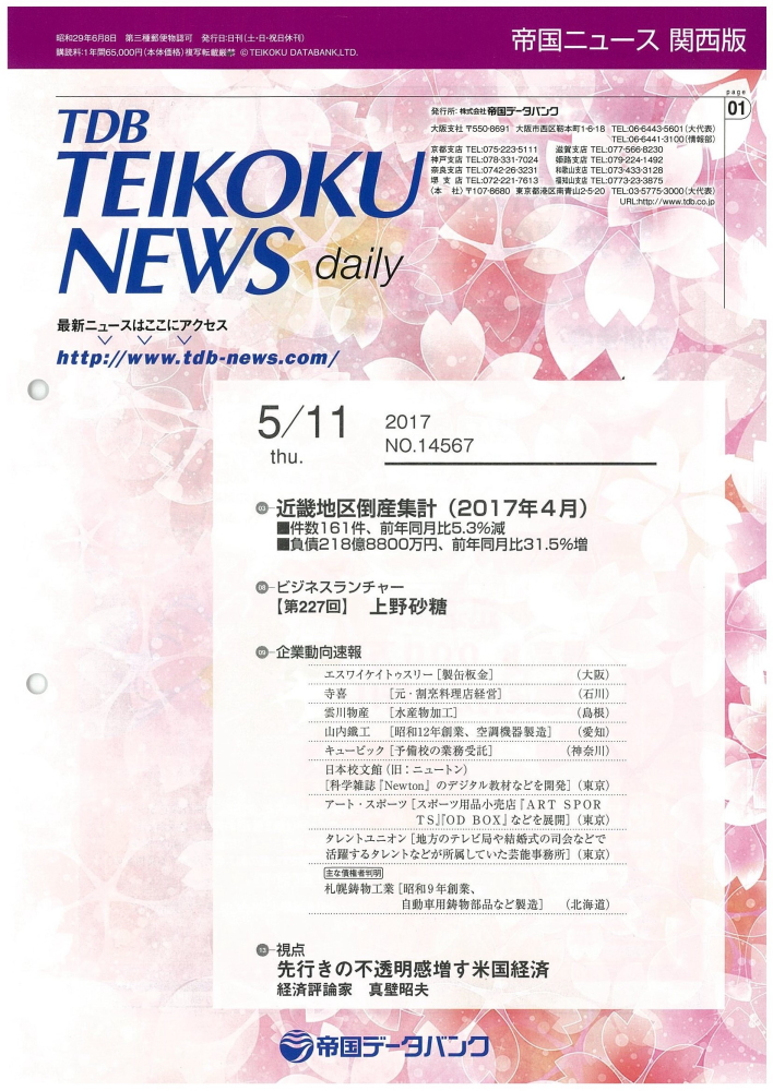 上野砂糖のお砂糖ブログ 帝国データバンク 帝国ニュース関西版 に上野砂糖取材記事が掲載されました