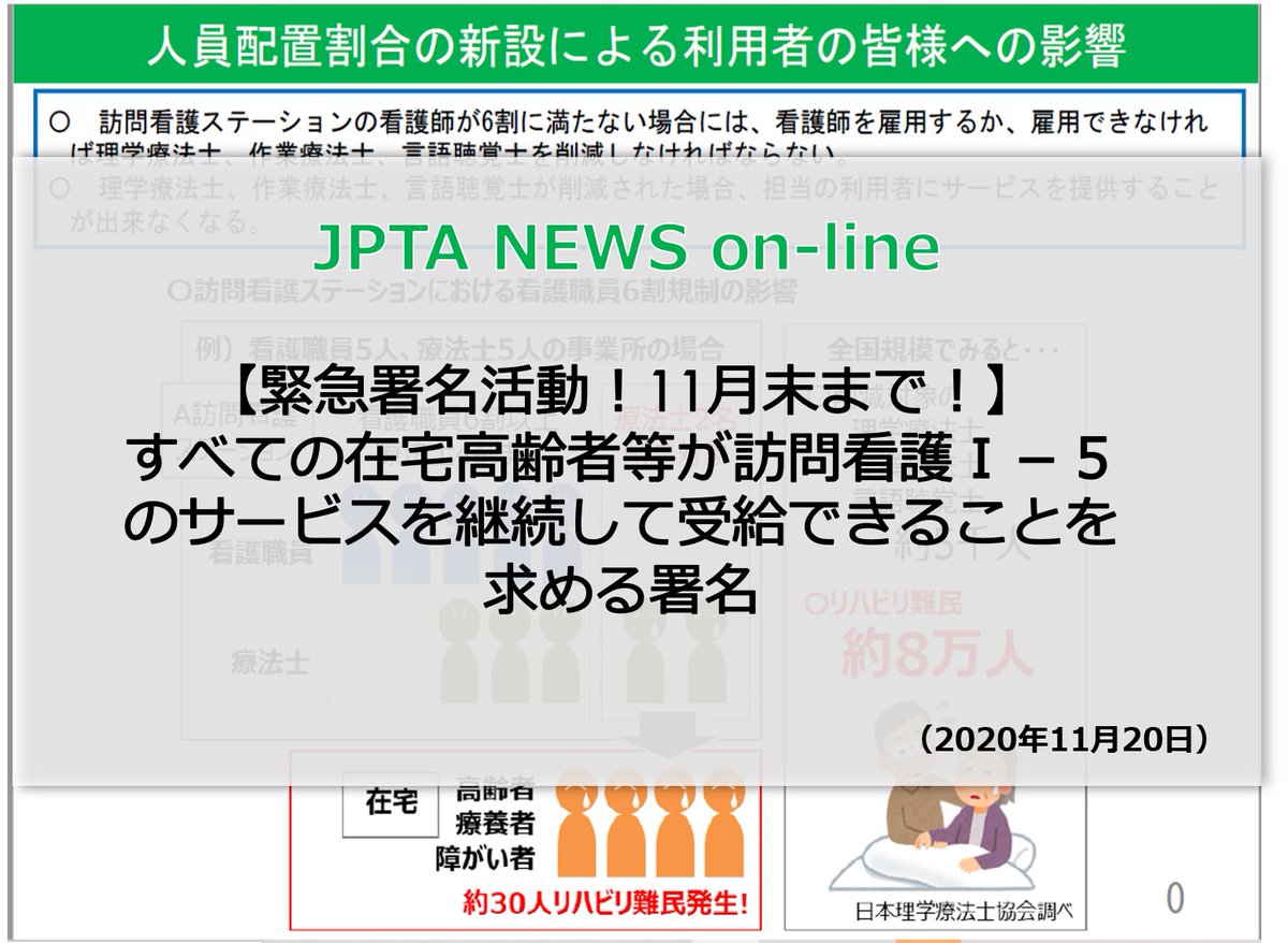 公益社団法人日本理学療法士協会 على تويتر Jpta News On Line 緊急署名活動 訪問看護ステーションにおける人員配置基準の新設に関する緊急署名活動を実施 第1次締切11月30日 理学療法 訪問看護 署名 Https T Co Wilty82rbz Https T Co Hax0p86tsm