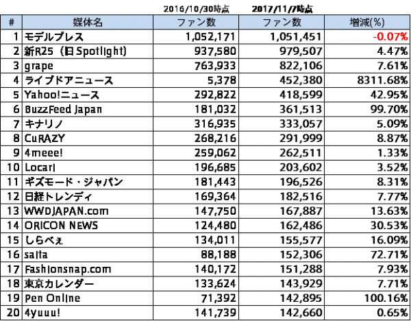 最新版 Web媒体 公式snsフォロワー数ランキング 2017年11月版 Pr会社 ビルコム株式会社
